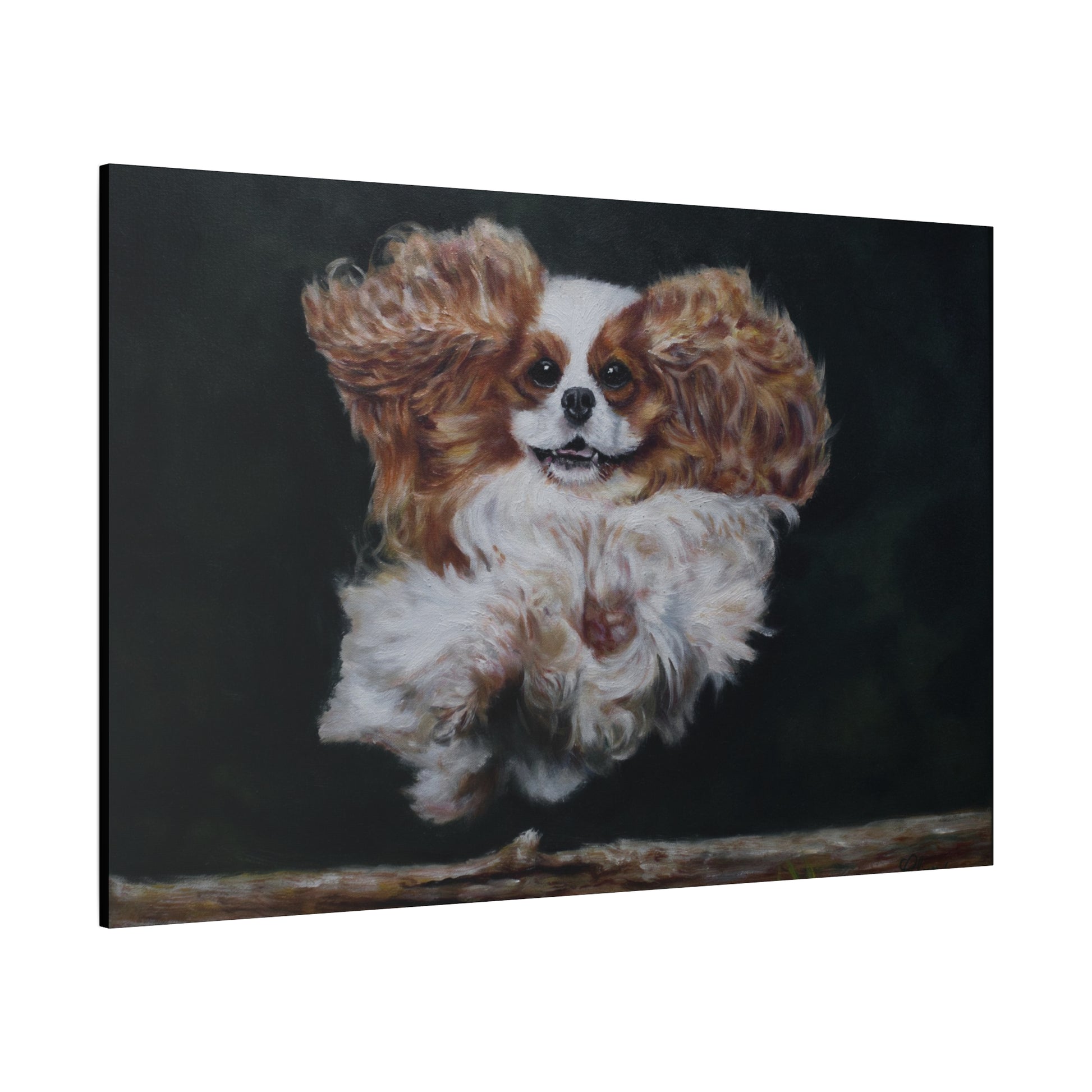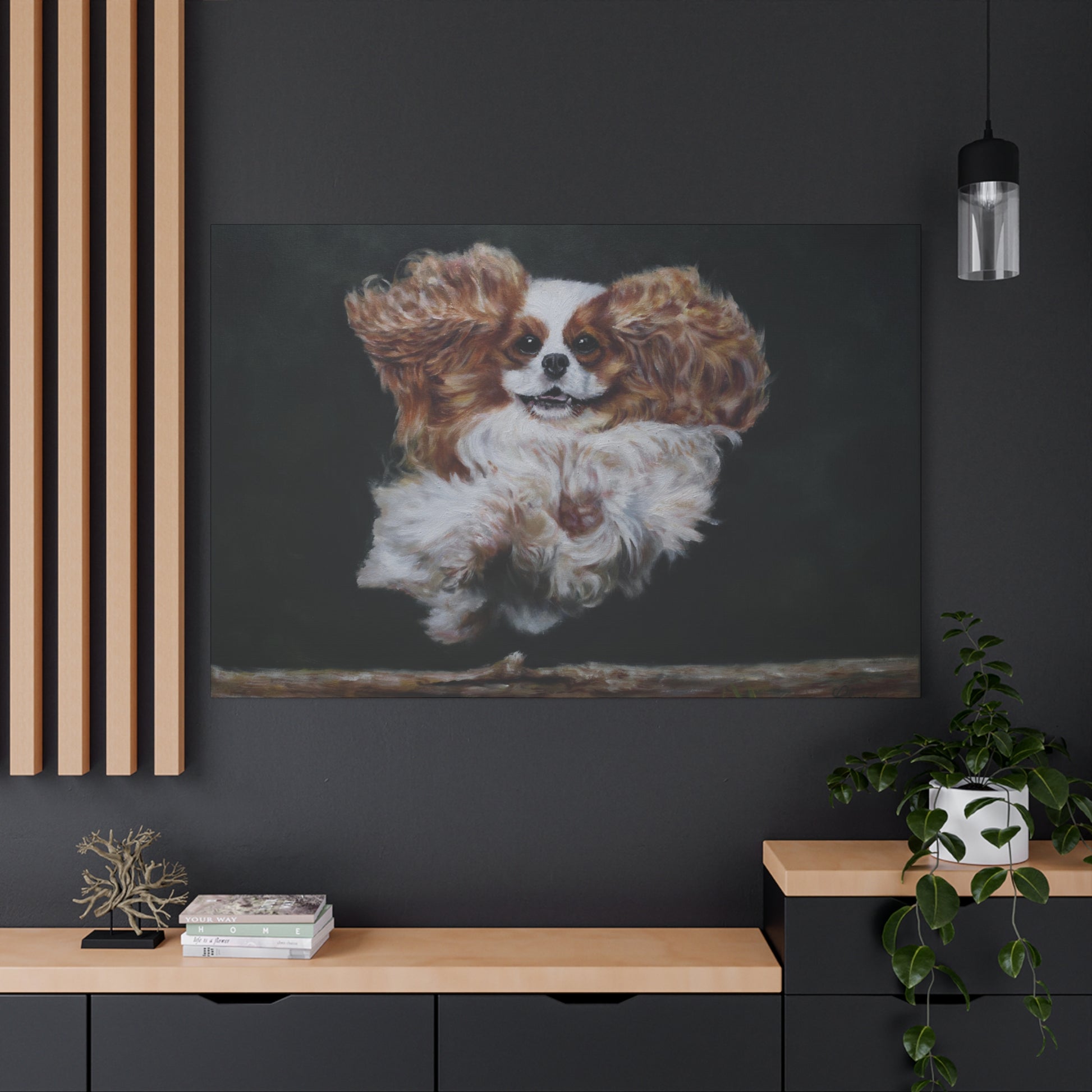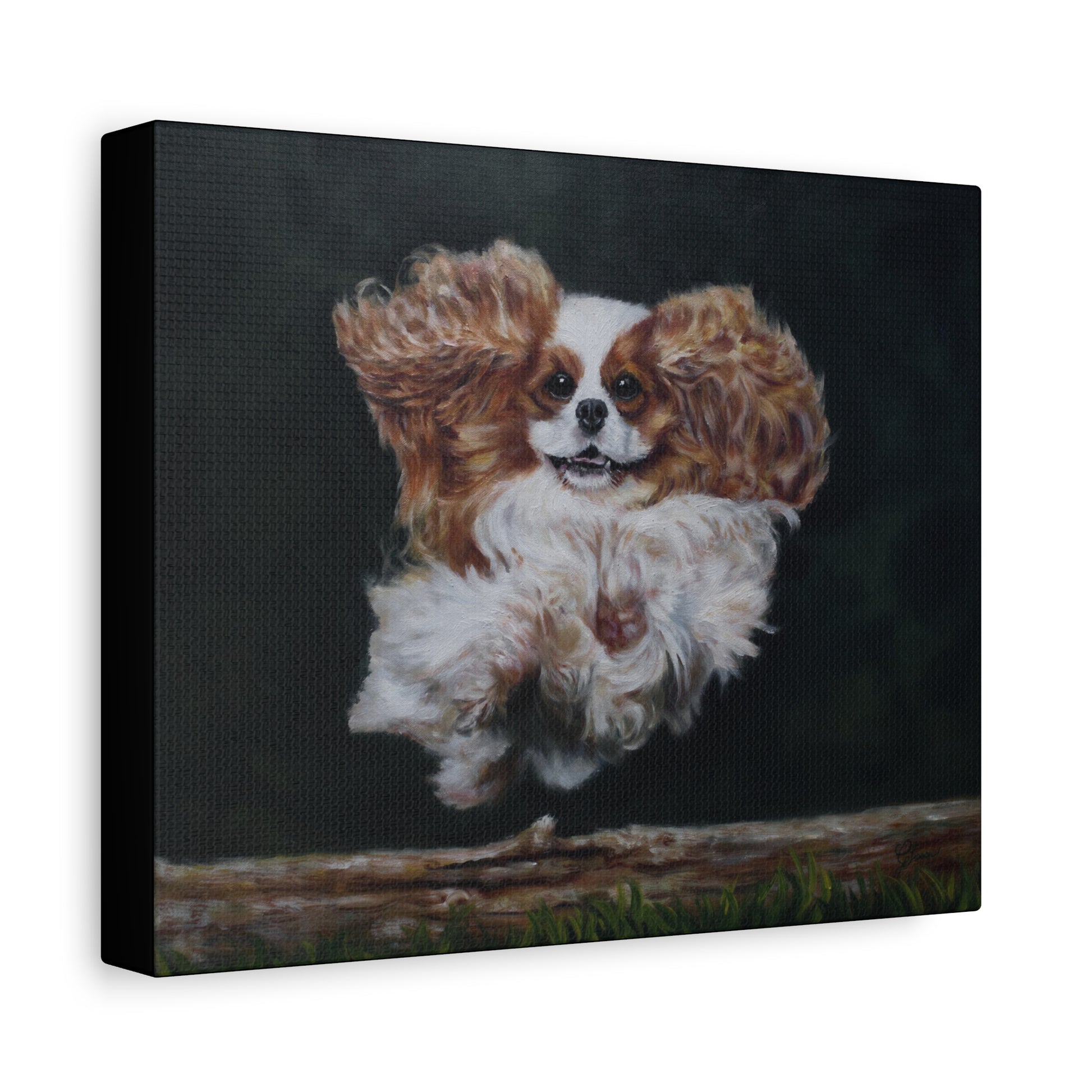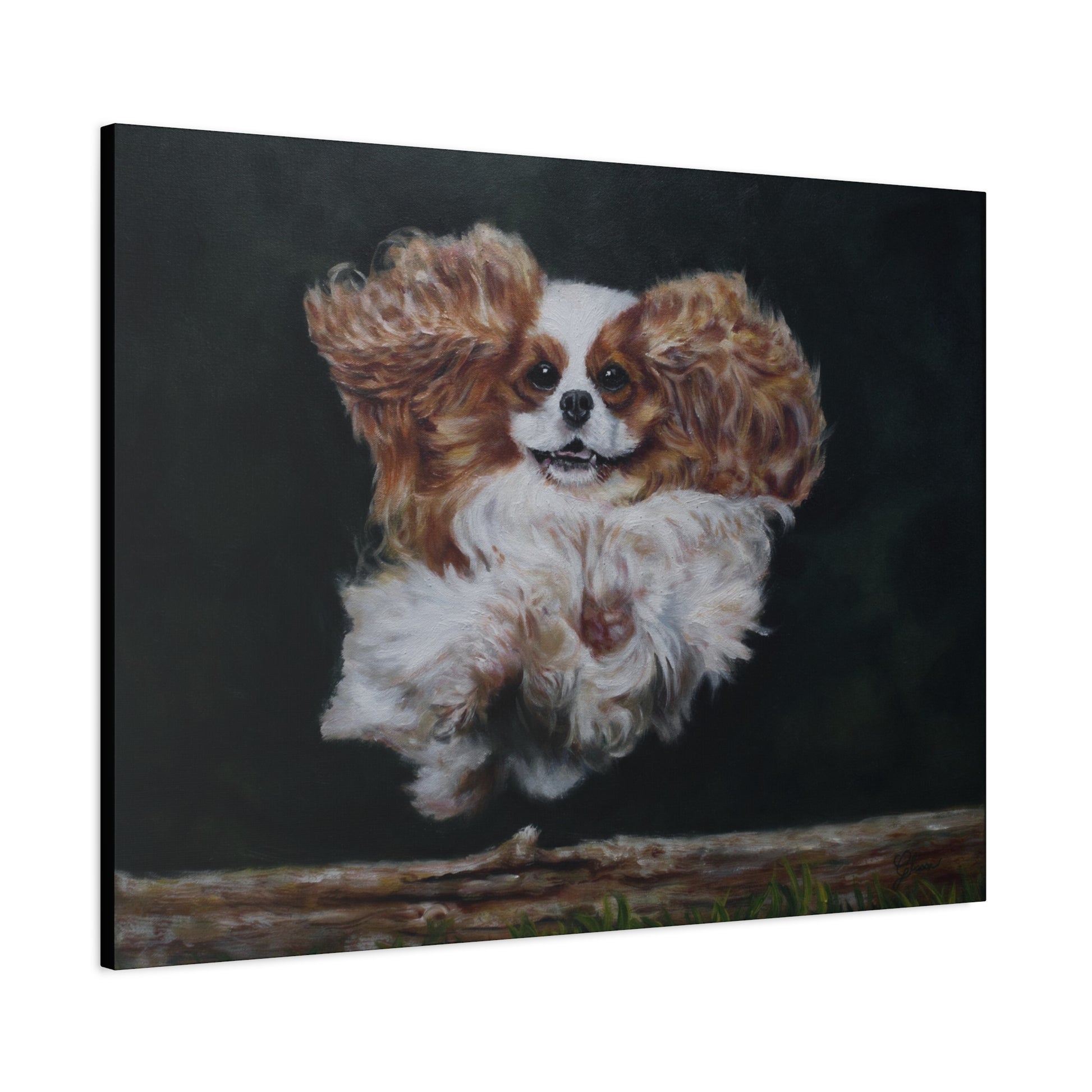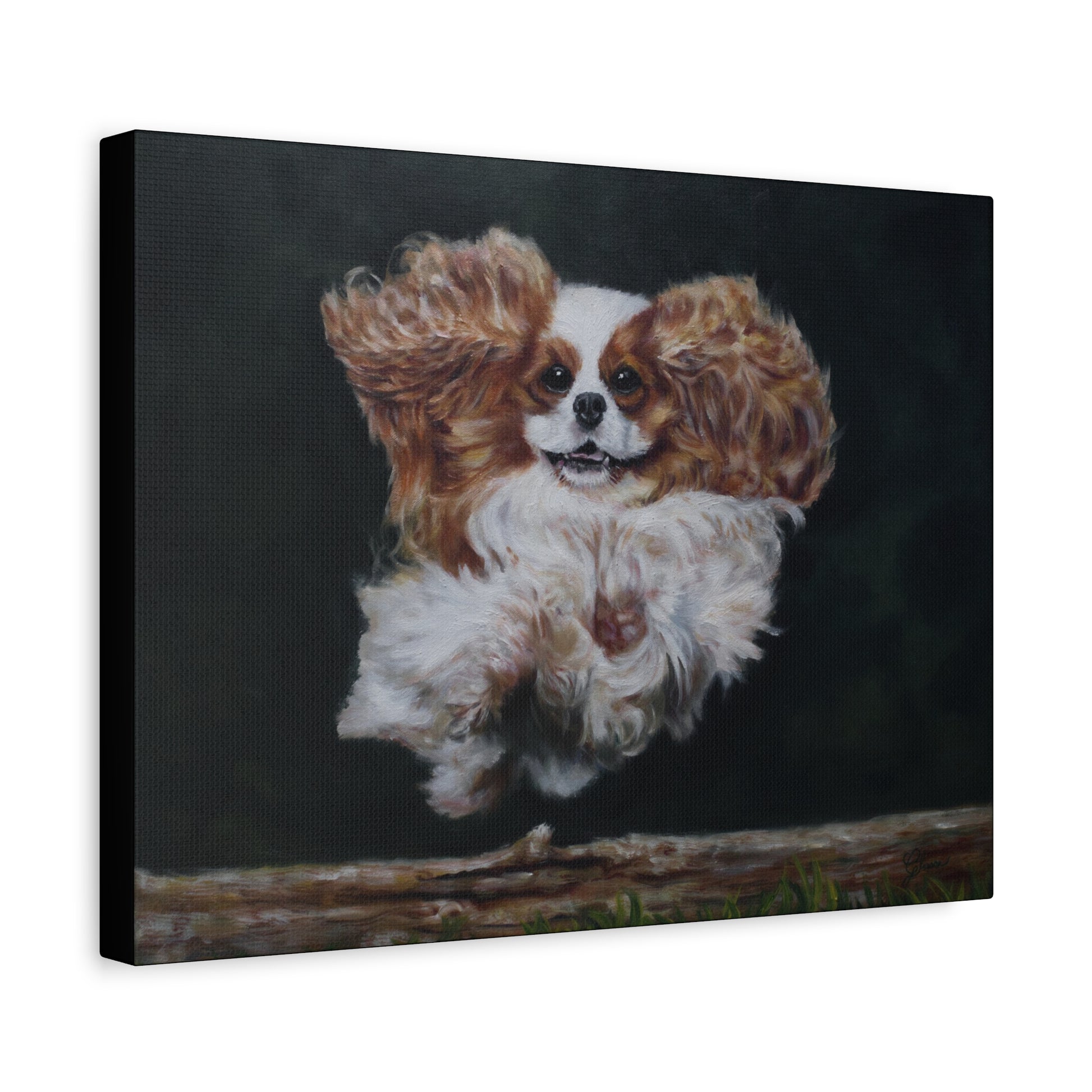 Experience the thrill of canine athleticism with "Athlete," a dynamic canvas print that captures a Cavalier King Charles Spaniel in mid-air, leaping effortlessly over a log.
