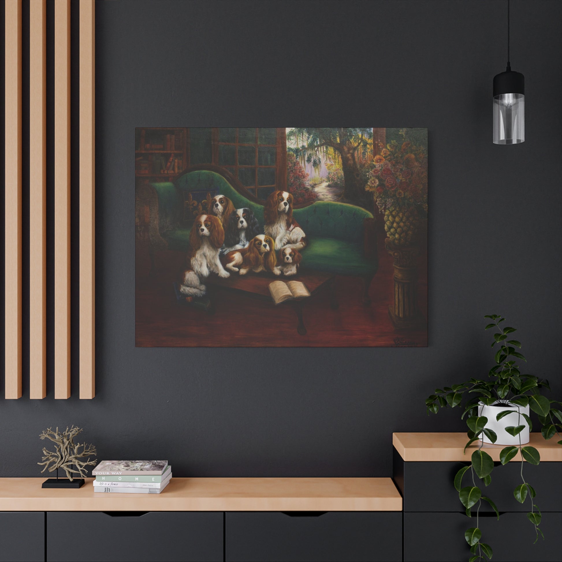 Celebrate the beauty of family with "Foundation," a beautiful canvas print that captures a beloved family of Cavalier King Charles Spaniels in a timeless group portrait.