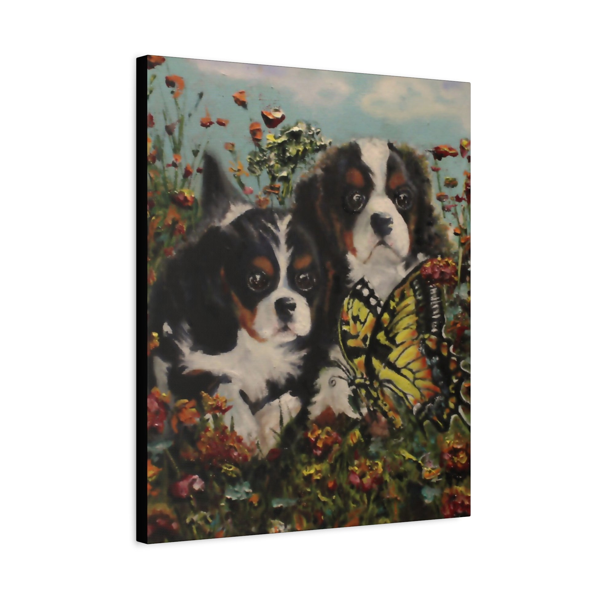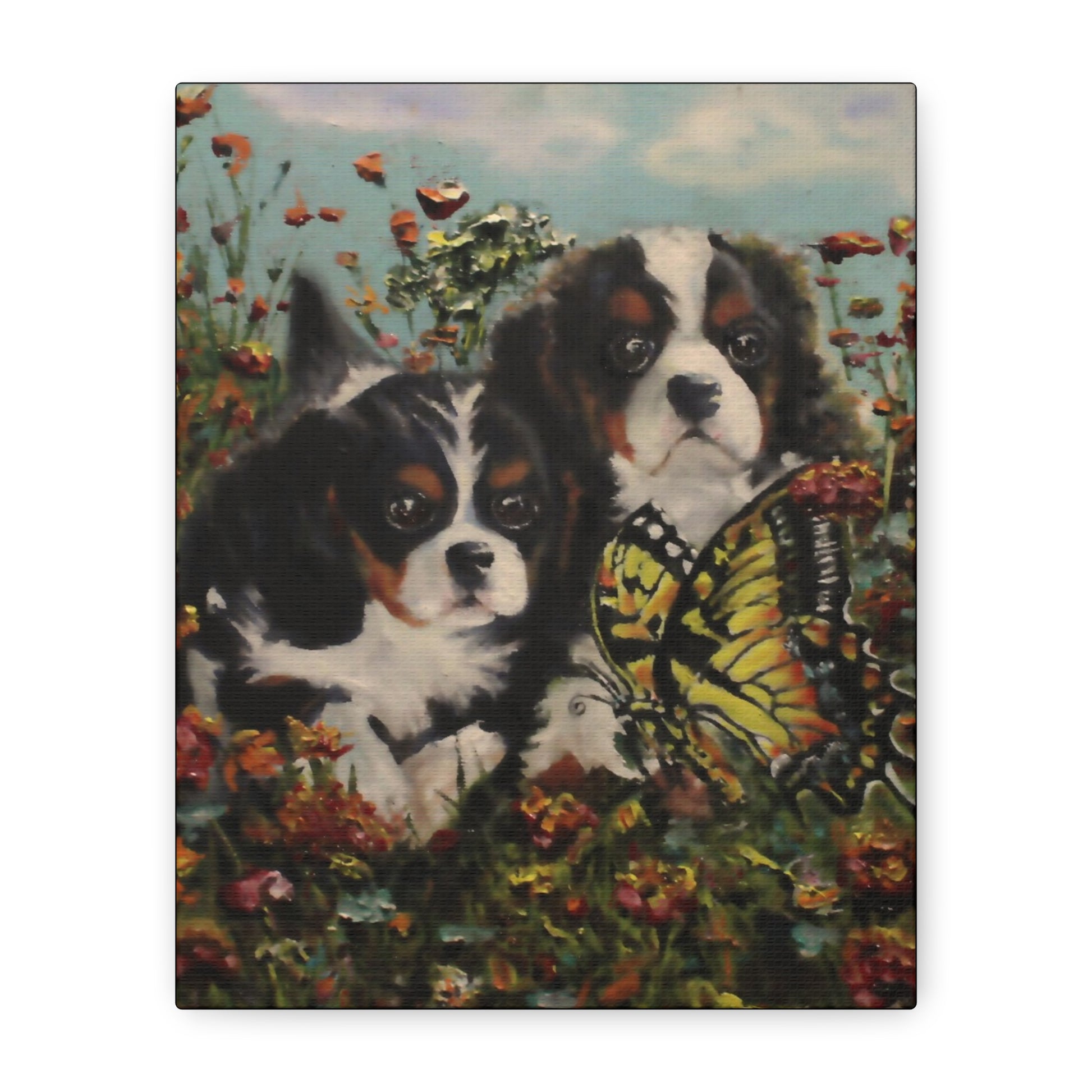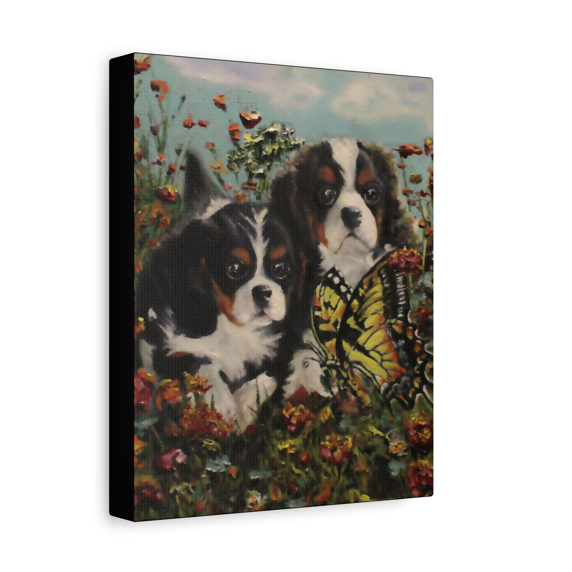 Discover a moment of pure wonder with "The Butterfly Effect," a charming canvas print that captures two tricolor Cavalier King Charles Spaniel puppies.