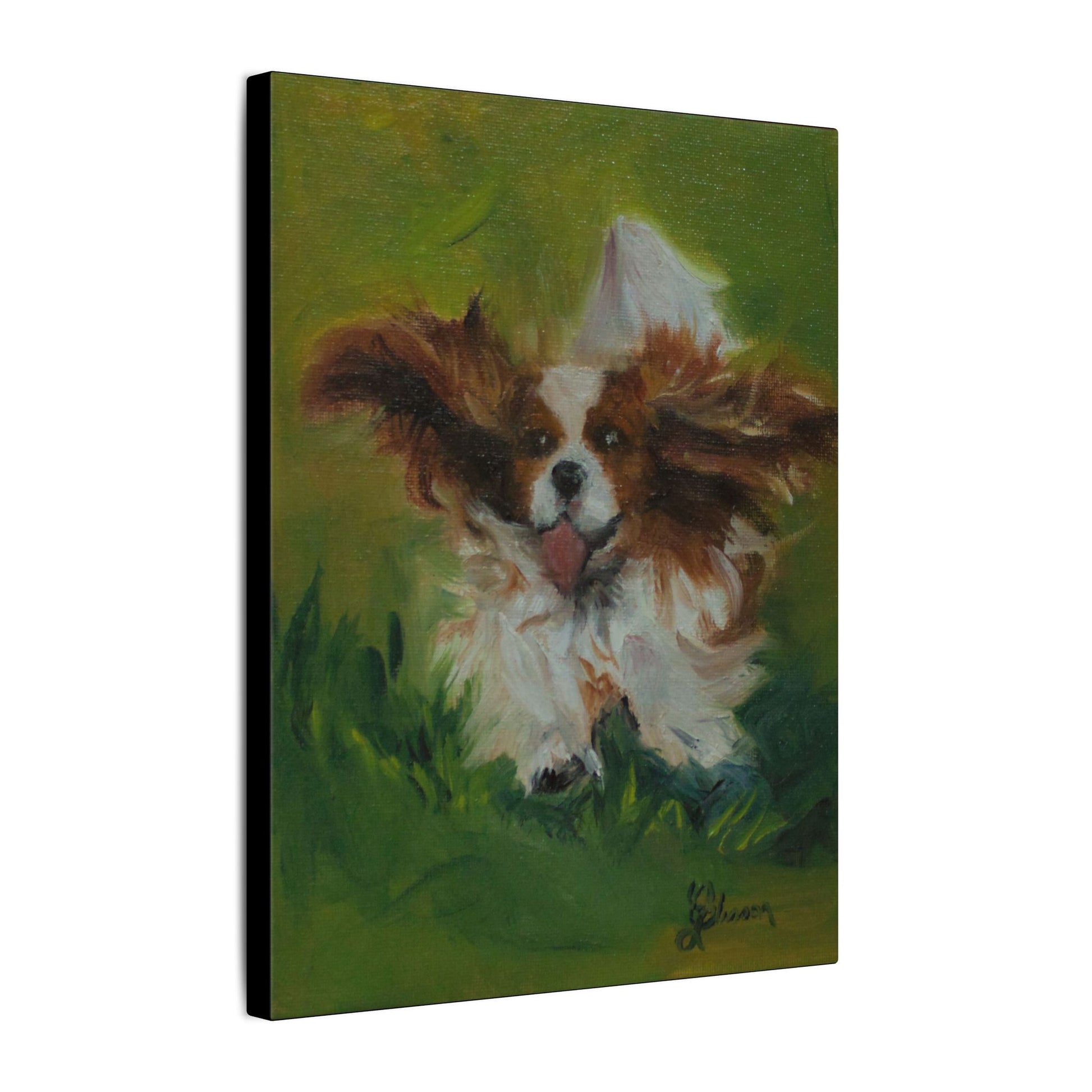 Feel the rush of pure speed with "Race," a vibrant canvas print that captures a Cavalier King Charles Spaniel running at full throttle across an open field.