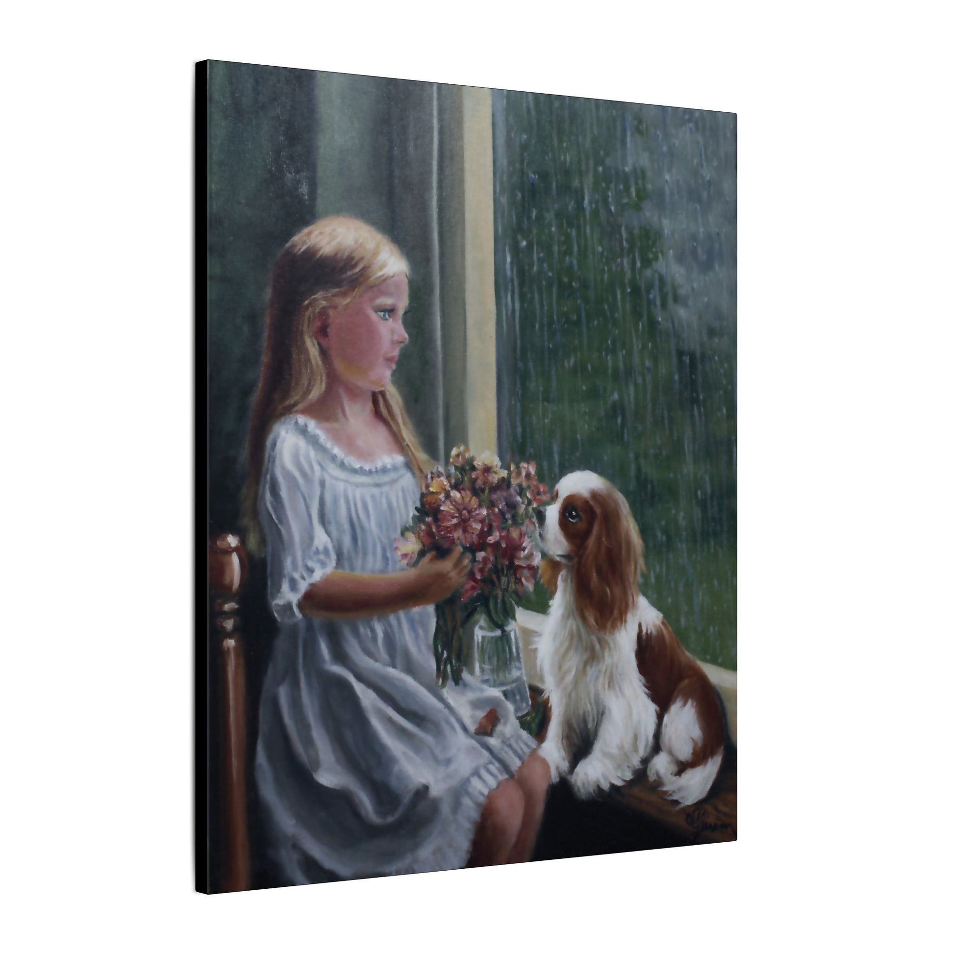 Dressed in a delicate blue dress, a young girl sits gracefully with her loyal Cavalier companion, holding a vibrant bouquet while rain gently streaks the window behind them. This painting captures the peaceful intimacy of a rainy day spent indoors with a beloved pet, creating a cozy and contemplative atmosphere that resonates with dog lovers and art enthusiasts alike.