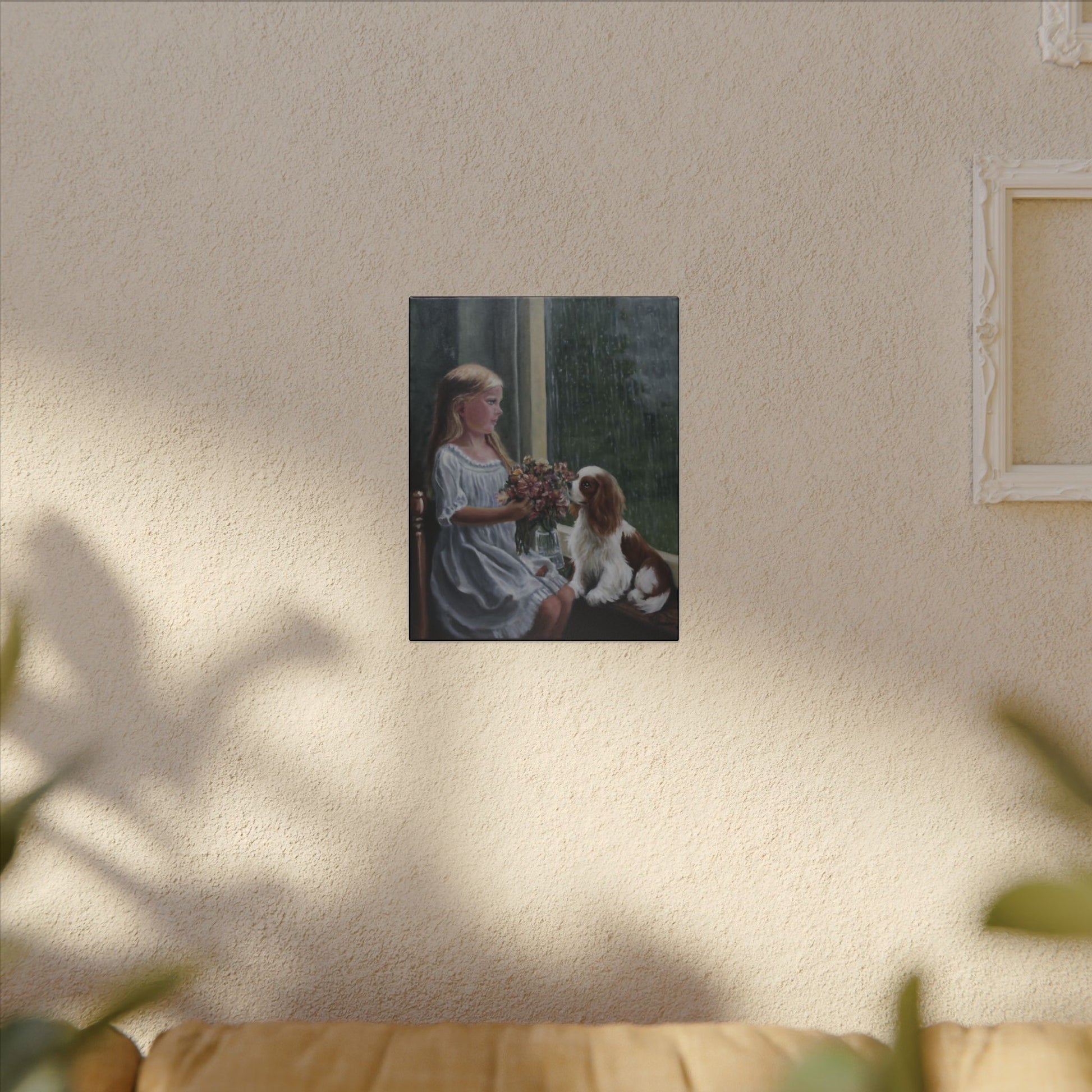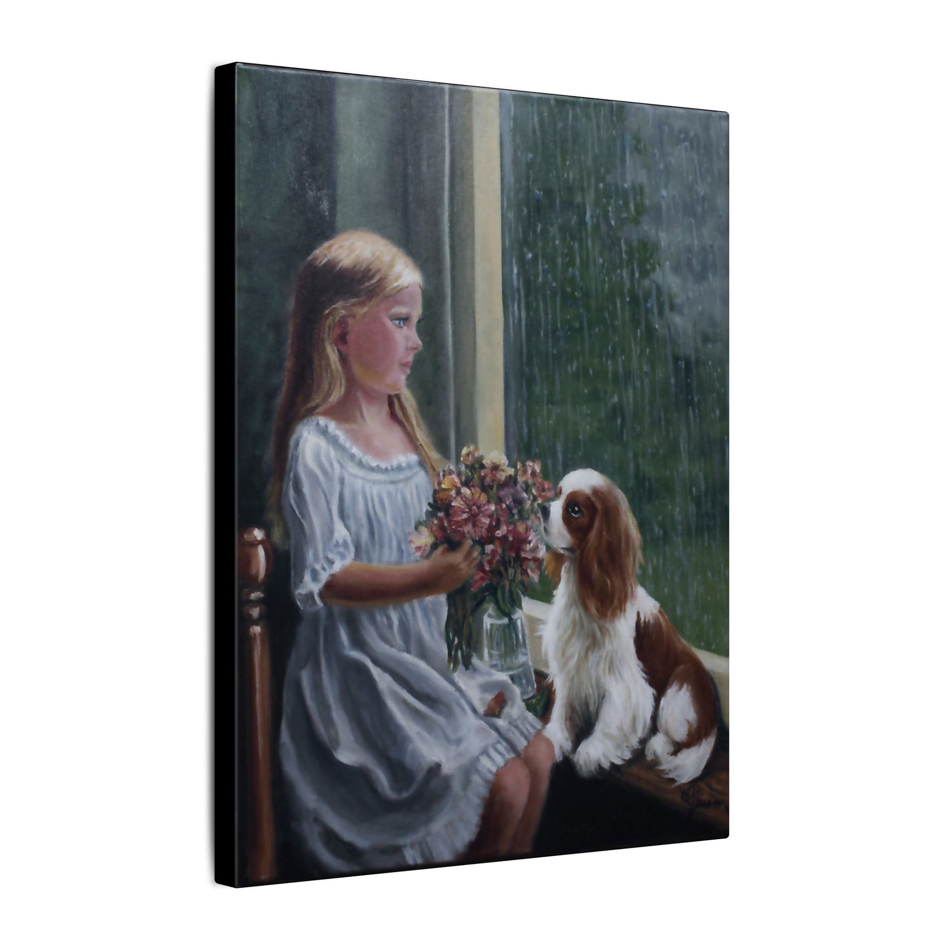 Experience the cozy charm of "Rainy Day," a tender canvas print that captures a young girl and her Cavalier King Charles Spaniel sharing a quiet moment by a rain-streaked window.