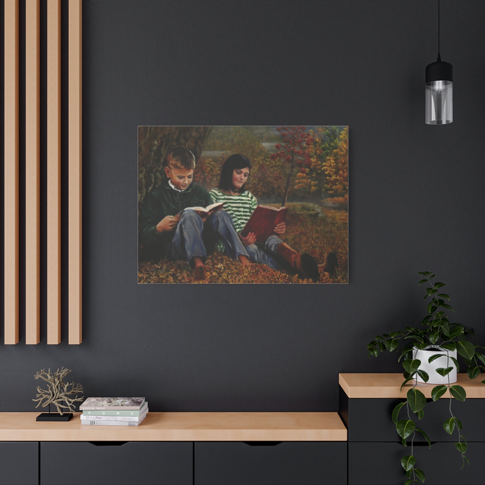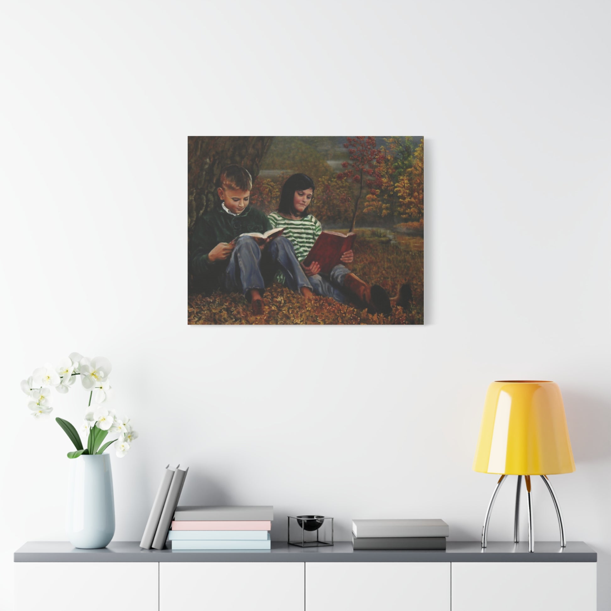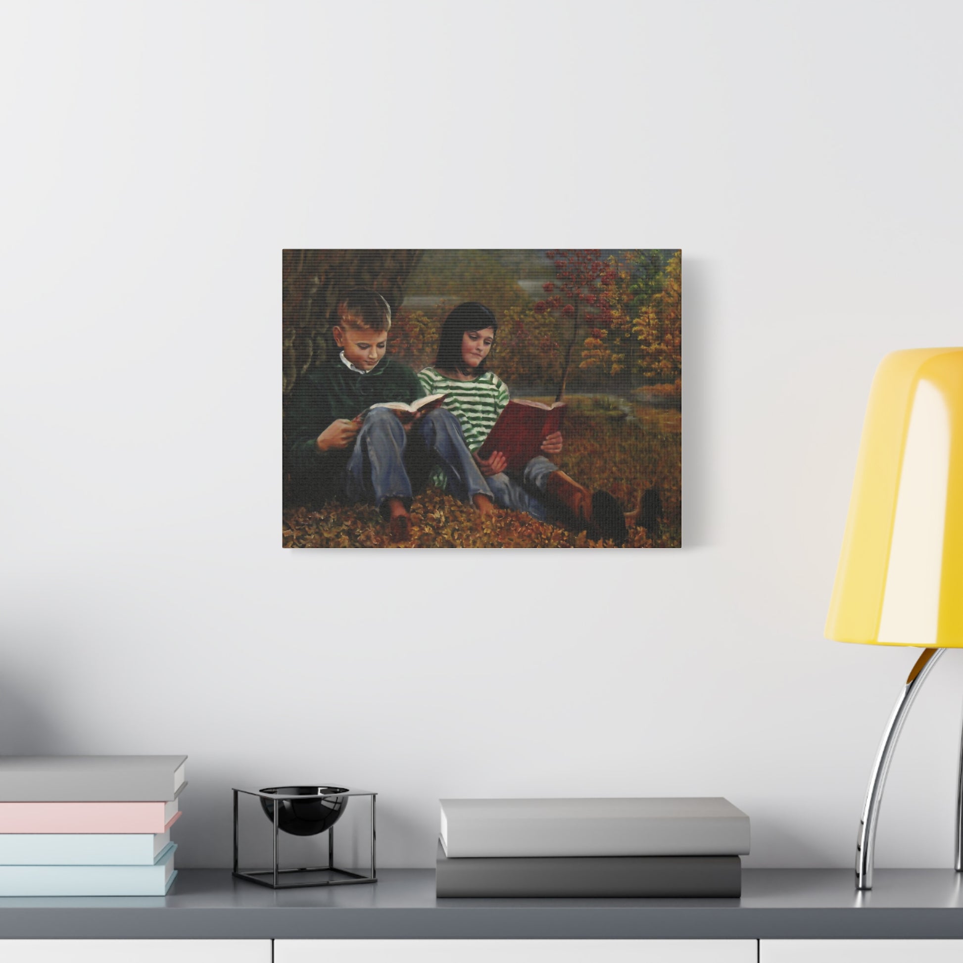 Relive the magic of a crisp autumn day with "Siblings," a heartwarming canvas print that captures two children immersed in their books beneath a towering tree.
